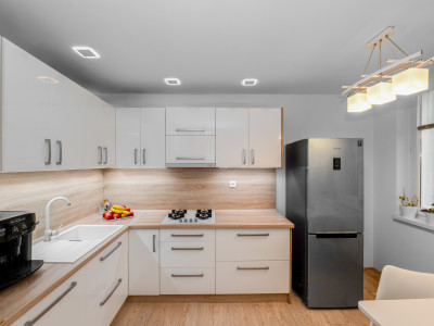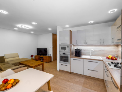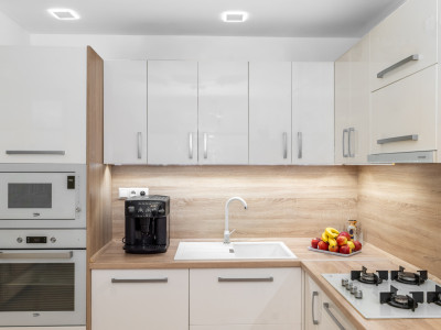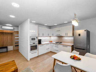 | moderná kuchynská linka s novými spotrebičmi, prepojená s obývacou izbou - dokonalé centrum rodinného života