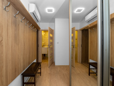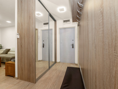 | vstupná chodba s veľkými vstavanými skriňami, ktoré poskytujú nadštandardné úložné priestory
