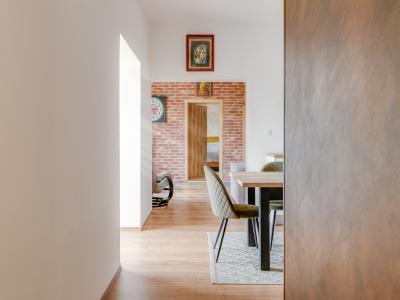Vstupnou halou sa dostávame do dennej časti domova, ktorá je osadená veľkoformátovými oknami prepúšťajúcimi do hlavnej časti dostatok denného svetla vytvárajúc v dome pocit vzdušnosti.